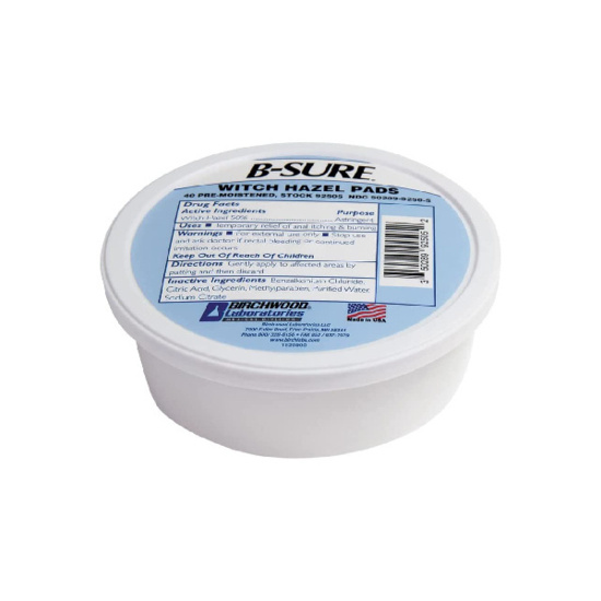 B-Sure® Witch Hazel Pads are saturated with 50% Witch Hazel, an astringent that helps to shrink swollen or inflamed tissues and relieve irritation, along with 12.5% non-greasy glycerin that acts as a protectant. Together they provide a cool, soothing compress. 40 pads per tub.