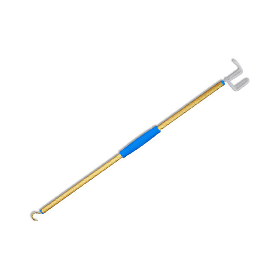 - Combination hook/pusher assists in putting on shirts and jackets, pulling up slacks or skirts, or removing socks.
